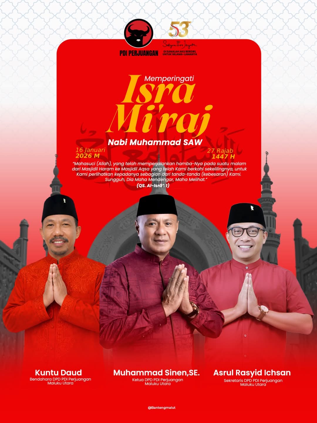 DPD PDI Perjuangan Provinsi Maluku Utara menyampaikan ucapan Selamat Memperingati Isra Mi’raj Nabi Muhammad SAW 27 Rajab 1447 Hijriah yang bertepatan dengan 16 Januari 2026 Masehi. Ucapan tersebut disampaikan secara resmi oleh jajaran pengurus DPD PDI Perjuangan Maluku Utara, yakni Ketua DPD, Sekretaris DPD, serta Bendahara DPD.