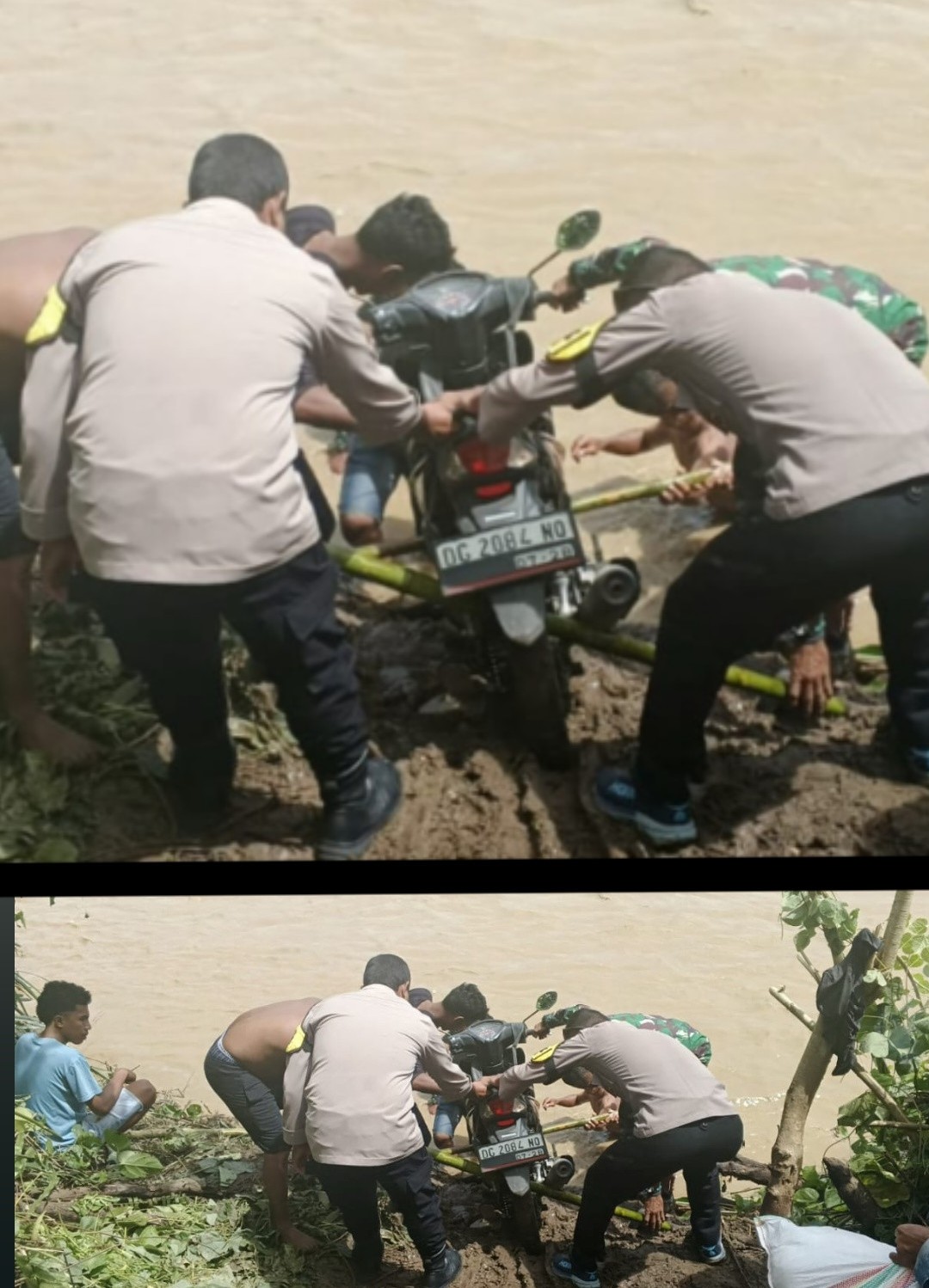 Tidak hanya membantu warga menyeberang, aparat juga terlihat memikul kendaraan roda dua milik masyarakat agar dapat melewati aliran Sungai Aru dengan aman. Aksi sigap tersebut mendapat apresiasi dari warga setempat yang sangat terbantu di tengah kondisi darurat.