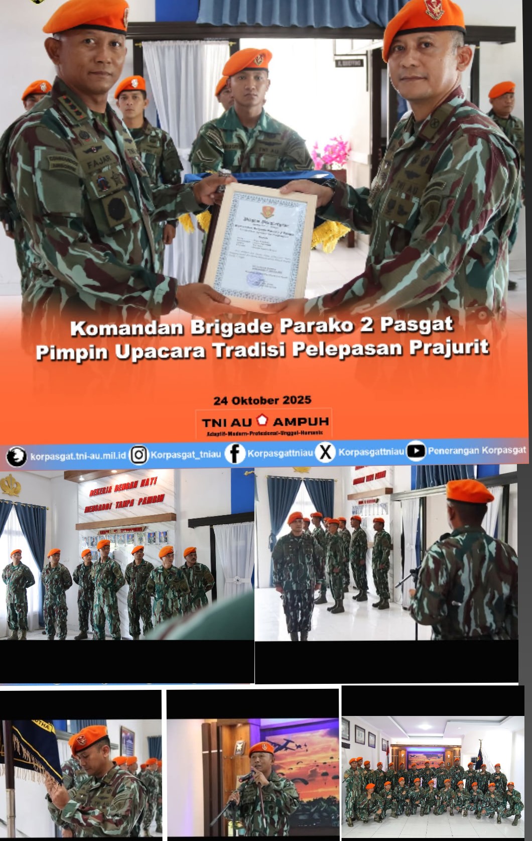 MAKASSAR, BRIGADE PARAKO 2 PASGAT — Komandan Brigade Parako 2 Pasgat, Kolonel Pas Abdul Fajar, M.Han., memimpin upacara tradisi pelepasan prajurit Brigade Parako 2 Pasgat yang berlangsung di lobi Markas Brigade Parako 2 Pasgat, Jumat (24/10/2025).