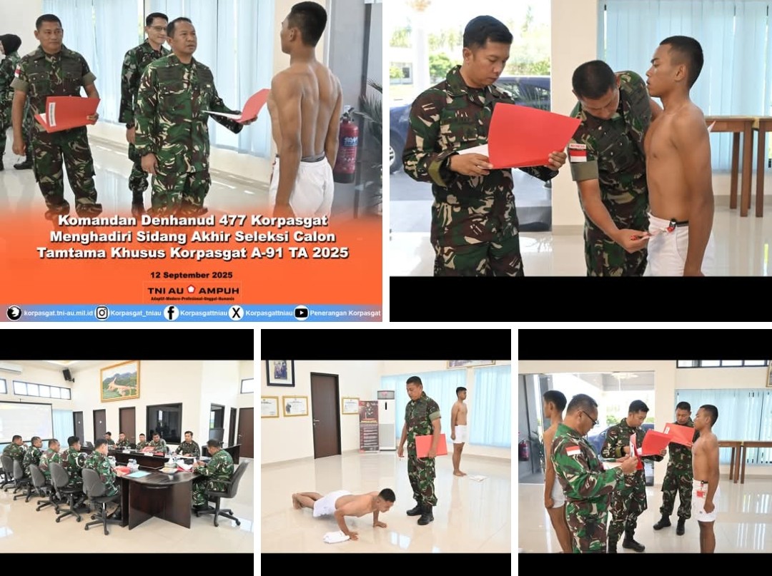 –Dalam rangka menjaring calon prajurit terbaik, TNI Angkatan Udara melalui Lanud Raden Sadjad menyelenggarakan Sidang Penentuan Akhir Daerah (Pantukhirda) untuk Calon Tamtama Khusus Korpasgat Gelombang 3 Angkatan 91 Tahun Anggaran 2025. Kegiatan ini berlangsung di Gedung Graha Serasan dan dipimpin langsung oleh Danlanud RSA, Kolonel Pnb Onesmus Gede Rai Aryadidan, serta dihadiri Komandan Denhanud 477 Korpasgat, Letkol Pas Amrin, S.Sos., M.M., yang ikut serta dalam proses penilaian akhir.