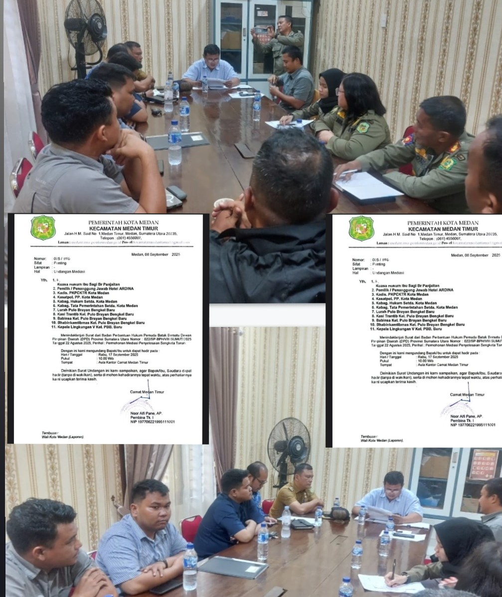 Rapat Mediasi pun ditunda hingga 26 September 2025 mendatang, untuk menunggu hasil data atau tanggapan dari pihak Dinas Perumahan dan Pemukiman Kota Medan agar rapat mediasi dapat berjalan dan didiskusikan secara musyawarah dan dalam kesempatan ini kami selaku Kuasa Hukum Ibu S Panjaitan menyampaikan terimakasih kepada Lurah Pulo Brayan Bengkel Baru, Efendi Gurusinga, SE, Camat Medan Timur, Noor Alfi Pane, AP melalui Kasitrantib Gunung Partahian dan Organisasi Perangkat Daerah (OPD), serta Babinsa yang telah menyediakan waktunya dalam rapat Mediasi yang berlangsung hari ini, Tutup Daniel.