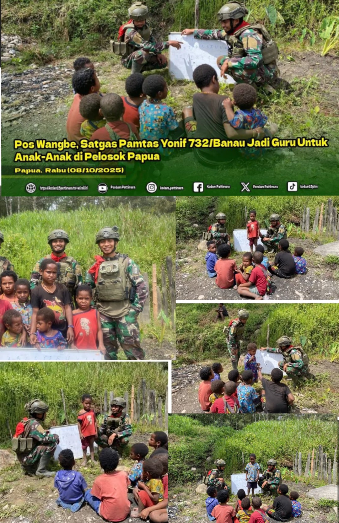 Danpos Wangbe, *Kapten Inf Gery*, menyampaikan “Kami yakin bahwa perbatasan yang kuat tidak hanya dibangun dengan senjata, tetapi juga dengan SDM yang cerdas. Kegiatan Papua Melek ini adalah wujud bakti kami, bentuk kepedulian TNI kepada generasi penerus bangsa di ujung timur Indonesia. Meski dengan sarana yang terbatas, semangat belajar anak-anak ini sangat luar biasa.” ujar Kapten Gery.