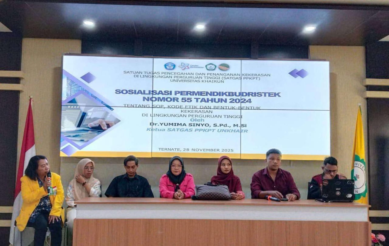 Ternate โ Satgas Pencegahan dan Penanganan Kekerasan di Perguruan Tinggi (PPKP) Universitas Khairun kembali memperkuat upaya pencegahan kekerasan melalui sosialisasi Permendikbudristek Nomor 55 Tahun 2024 yang mengatur SOP, Kode Etik, serta bentuk-bentuk kekerasan di lingkungan kampus. Sosialisasi ini digelar di Aula Mini FKIP Kampus I Unkhair pada Jumat (28/11/2025) dan diikuti oleh dosen, tenaga kependidikan, serta mahasiswa.